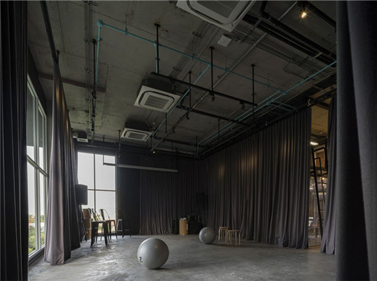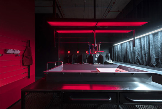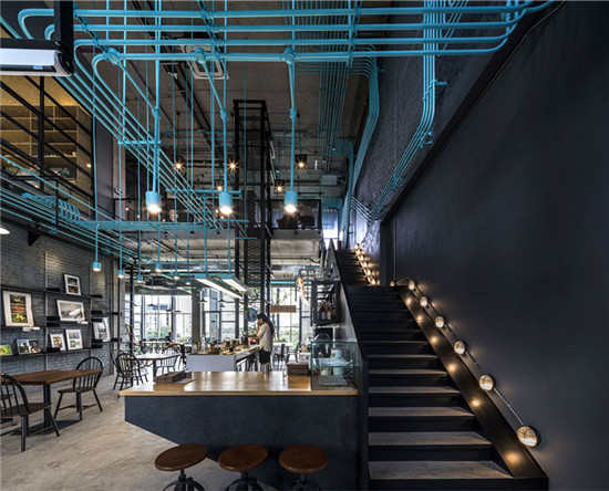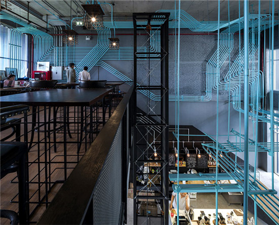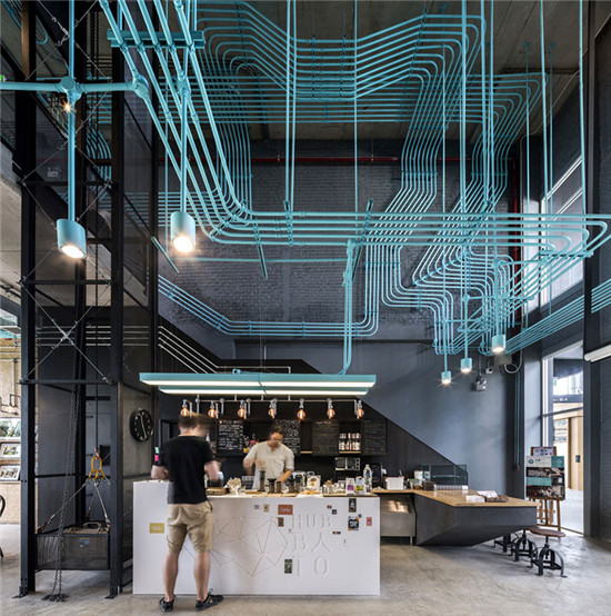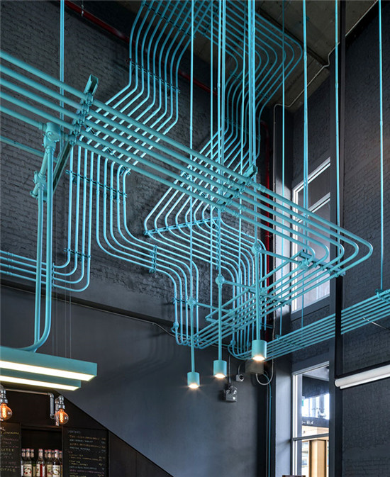 在深灰色的基底下,布满天花与墙面的绿松石色管线十分的抢眼,甚至是空间的照明,也是来自交织的管线,刻意的裸露带来强烈的视觉冲击,并以此将整个空间串联起来。