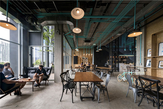 整个 Co-Working Space 面积宽敞,以工业厂房的形式接待着来访的客人,稍经修饰的地面与裸露的混凝土立柱,带来最为原始、粗犷的空间魅力,一层为咖啡厅,从售卖各种食品的吧台到充满工业感的桌椅,很难将它与工作空间联想到一块。