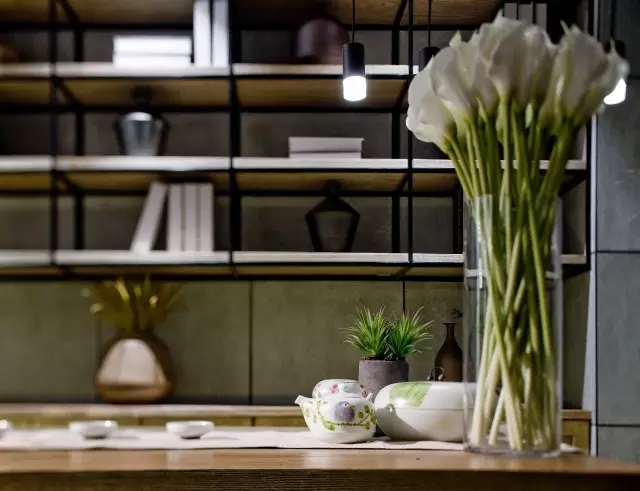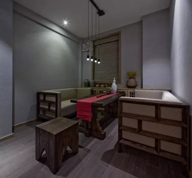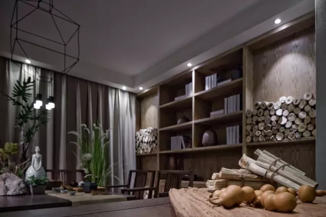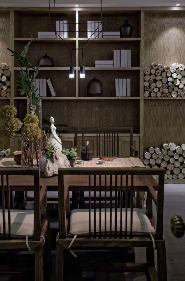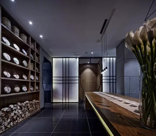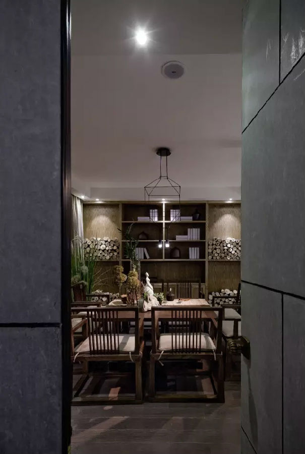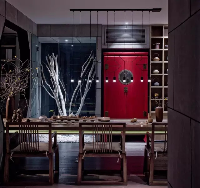吧台区和展示区延续了这种元素,一条长长的桌子穿过八角门洞而立,桌面上摆放着大小不一的装饰陶罐,桌子下面随意的放着几只蜡烛,增添了空间的氛围。桌面上悬挂着一排黑色线条组成的面灯,即实用又满足了装饰的需求。红色的中式高柜给素色的空间增添了一些活力。枯山水的文化在这里得到了很好的应用,白色枯木、石头在灯光的照射下愈发显得精致。
