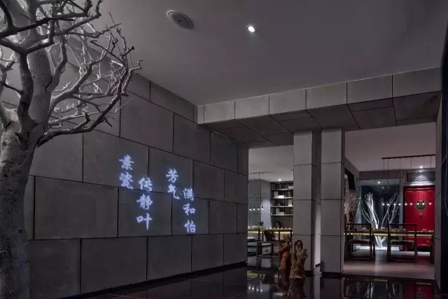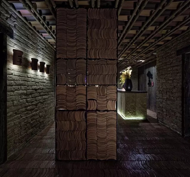 入门即是一道长长的竹林景观,古人云:“宁可食无肉,不可居无竹”,竹,是最能体现文人环境的植物。细细的枯竹构成一道竹林,而背打的灯光则透过竹林散发到地面,细细地看,竟是一片片精密拼装的红瓦。犹如古人的居所。