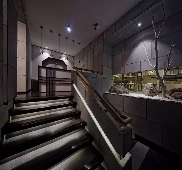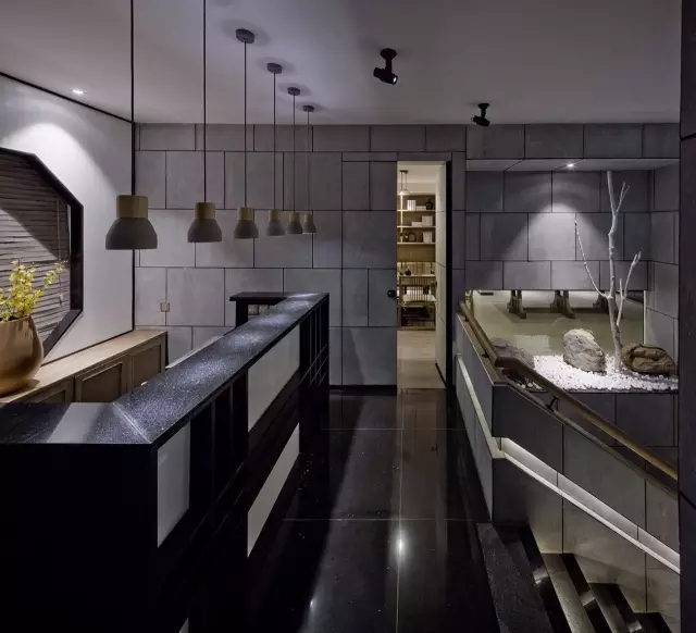 走道的尽头是水景,黑色的水底里露出几块尖尖的石头,水景的上方是竹编装饰灯,而背后的一面镜子让竹编灯层层地反射,让空间越发显得幽深。