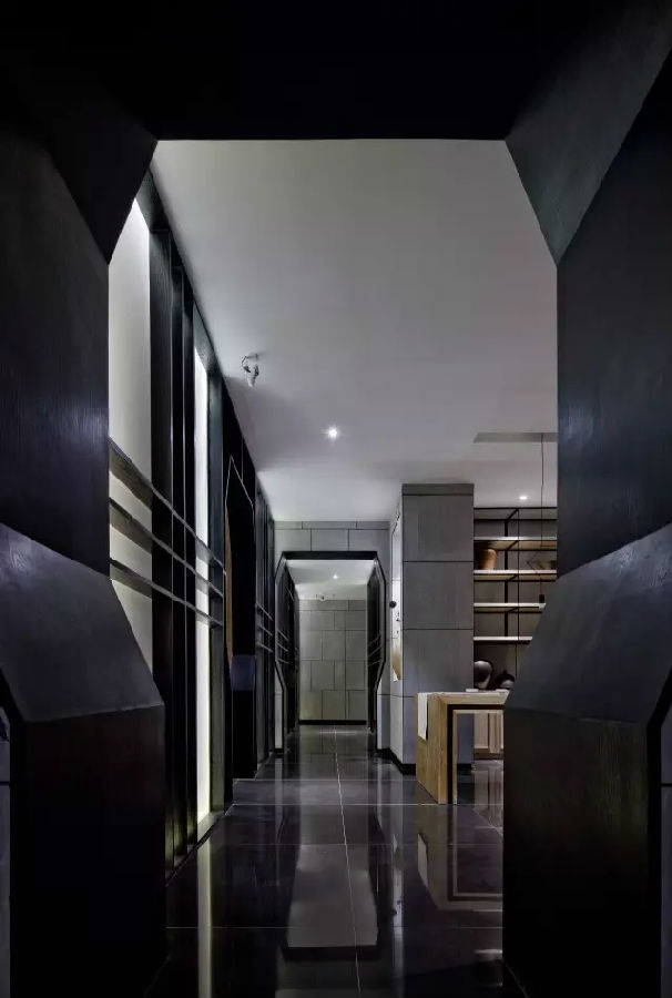 二楼的接待台没有复杂的造型,黑色石材的台面,黑色的木作线条装饰着正立面,在灯光的照射下,透过磨砂玻璃,散发出淡淡的黄光。在会客区,设计师运用中国古典元素,特意设计了一个八角形的门框,意味着人生的八面玲珑。