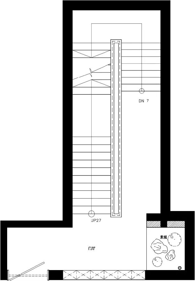 一楼的门厅规划了一个半通透的装饰柜,黑色哑光方管和实木层板组合而成,后置钢化玻璃,隐隐约约,使室内空间与室外空间有一个视觉上的交流。素色的水泥板墙面、素色的水泥板栏杆、黑色的花岗岩踏步在灯光的照射下愈发显得宁静、质朴。墙面的白色投影搭配一些小树枝装饰,还有旁边的白色枯木、石头装饰,禅的意境便油然而生,浑然天成。