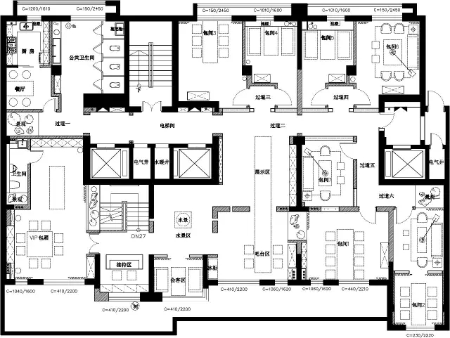 在平面布置上,一楼规划了门厅、景观区,二楼规划了接待区、包间、厨房、餐厅、卫生间等。在色彩运用上,以黑色、白色、木本色为主色调,灰色为辅色调,再搭配一些花饰、器皿,让整个空间与茶道精神合而为一的同时又展现空间的全部功能和意境。