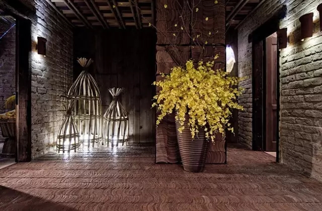 过道的尽头是接待台。粗犷的山石,顶上一条竹扁吊灯,别有一番意味,有趣又实用。通往洗手间的过道,地上几个竹编的装饰灯,圆乎乎,憨态可掬。灯光则透过竹编缝隙映射在墙上,地上,暖暖的。