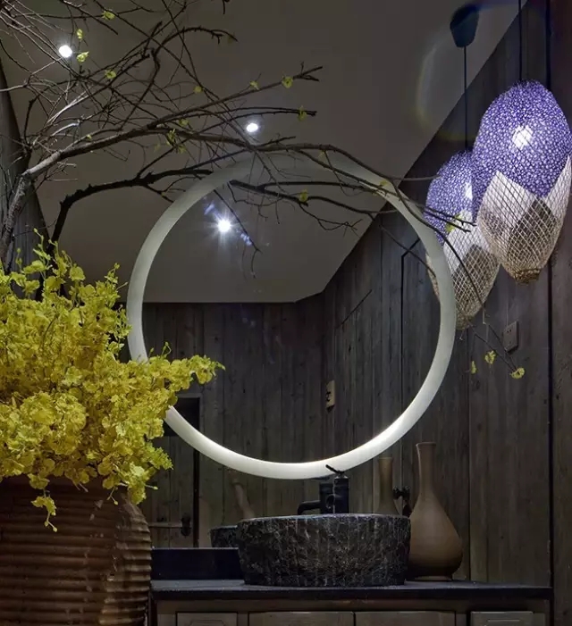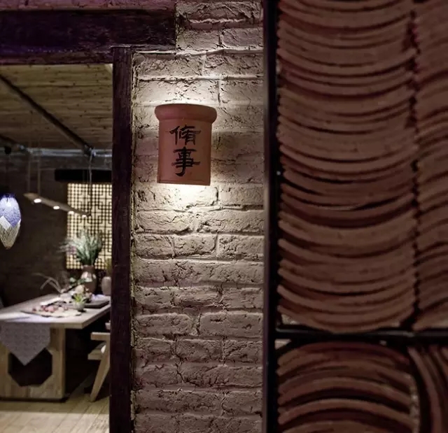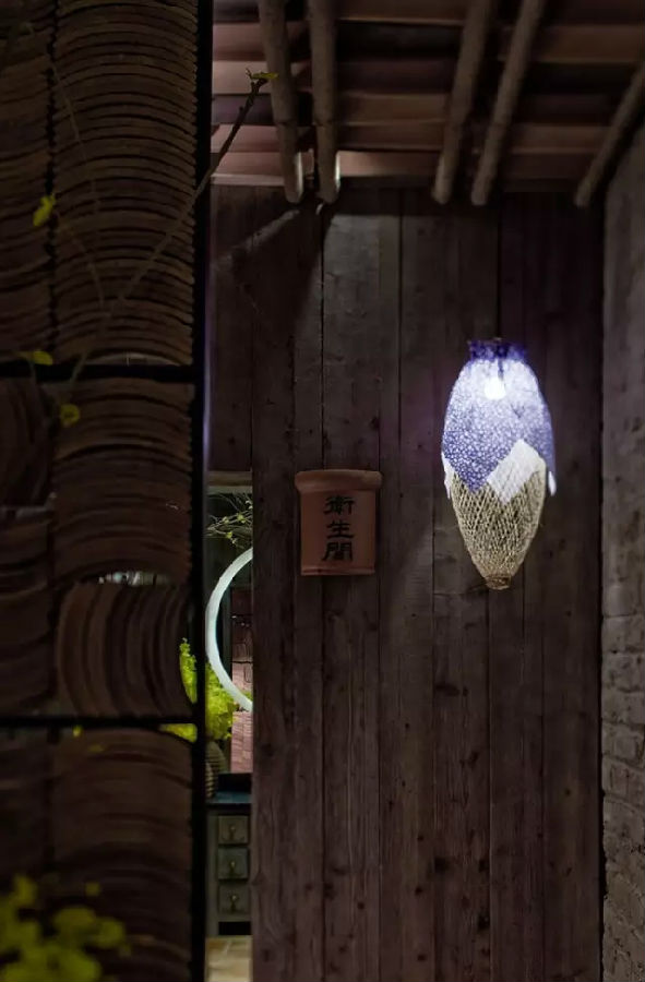 洗手间,红色古砖,原木色洗手台,边上一棵白色的枯木,跟镜前的小吊灯组成了一副古诗里的场景。卫生间过道。则用的是宽窄不一的原木板,包括隐藏在墙里的那道门。包间门旁的小壁灯则用瓦片做成,别致而独特。