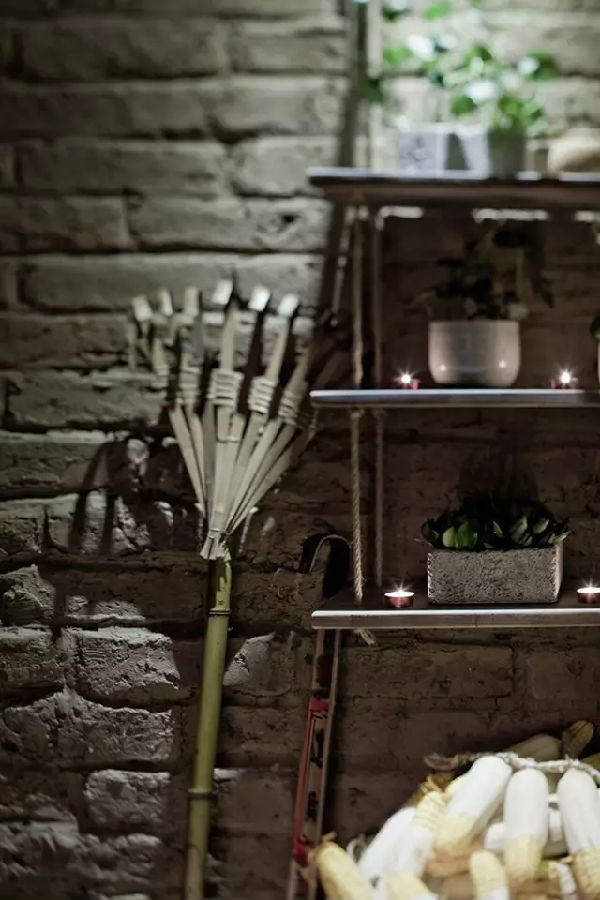 主要材料:土砖,竹子,红瓦片,做旧实木板,木拼条,竹编灯