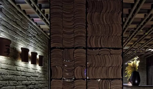 另一走道用一高黑条方管和红瓦组成的隔断,将过道隔成两条,包间门则依然采用用旧木板,门板上方一块长长的门楣,如同小时奶奶家的大门。