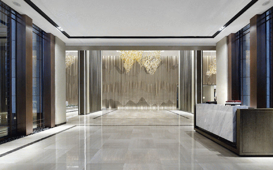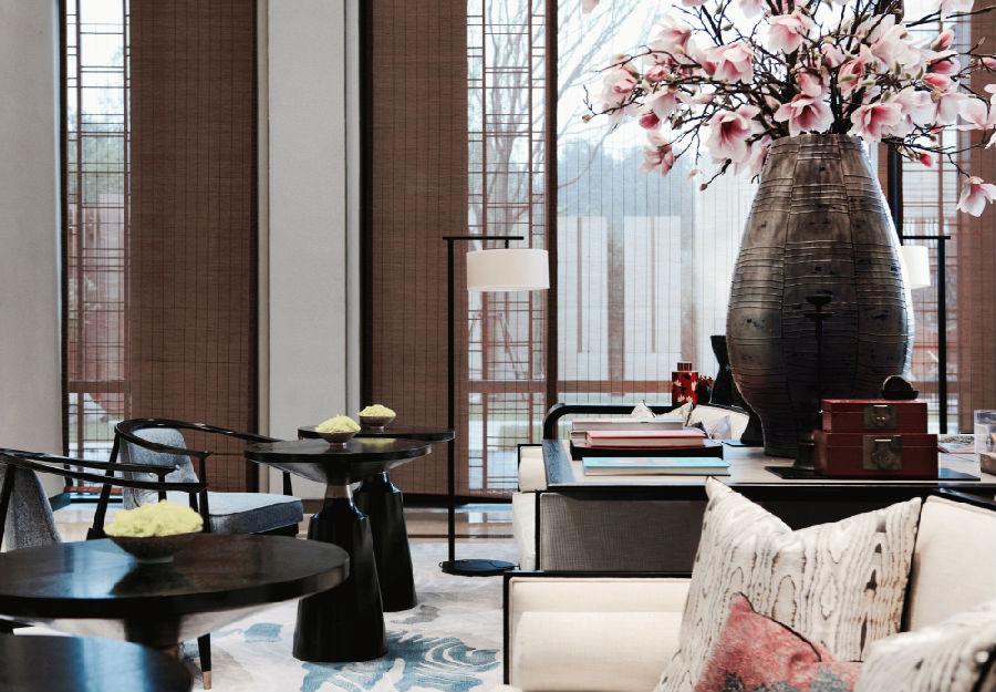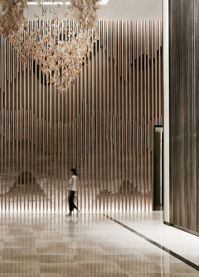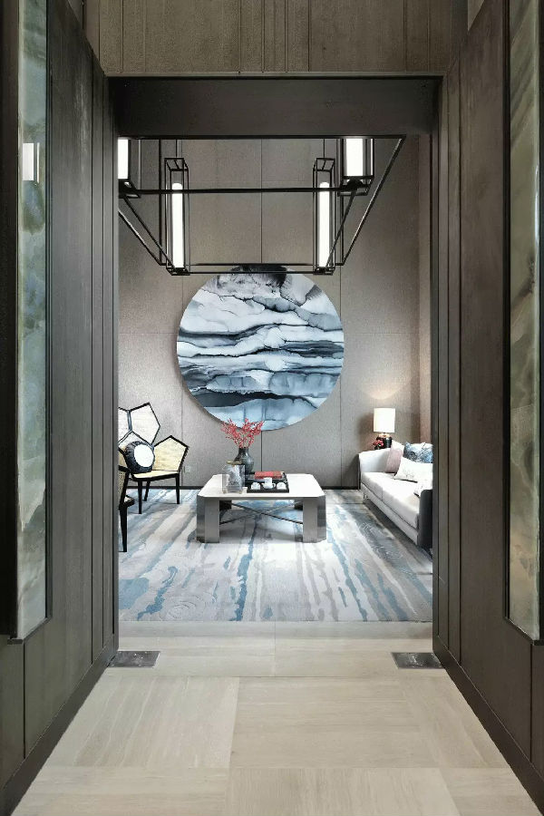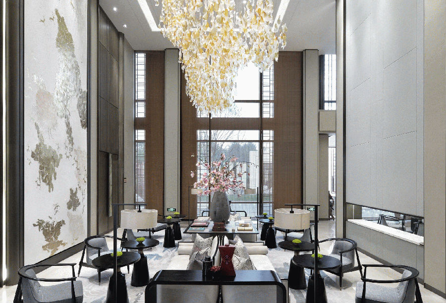 在海珀云翡的设计中,以文化为内核,进行提炼和度越,在这里你可以看见清新华丽的海派与深厚隽永的京派相对话。在设计中,为了增强访客感官体验,设计师并不局限于室内,更注重内外景之融合。从整体参观东栋着手,研习园林造景,步入室内前,景观与水面相印,建筑静影沉璧。