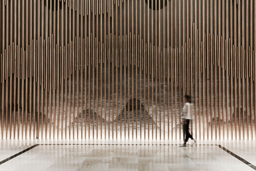 进入室内,一步一景,步步流连,玻璃盒子般的接待空间似漂浮水中,与内空间皆以水中灵树印景。空间上的转换与对比形成感官心理上的意境营造,接待空间通透为虚,与二层调控整体为实的内院空间形成反差,如桃花源般,给予更大的心灵震撼。