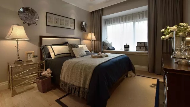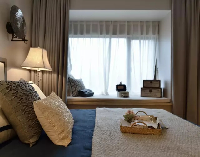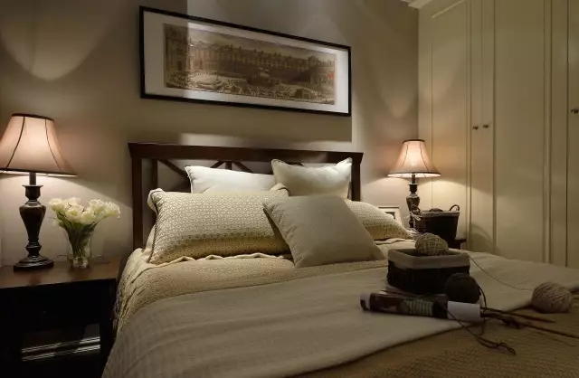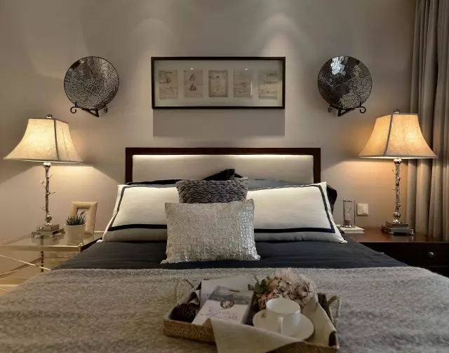 卧室所有家具的摆放都非常得体,更确切的说是精致,床头挂画是两个创意小盘子,就连床头的角几都与众不同。
