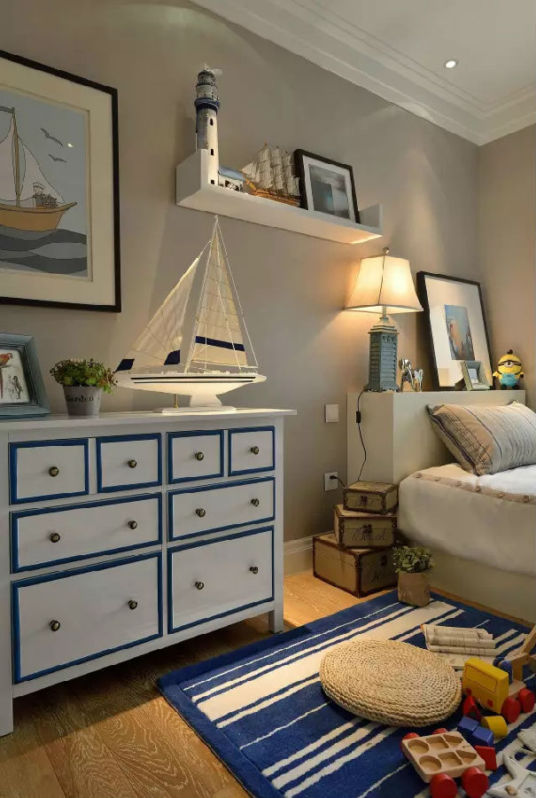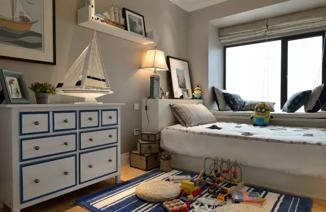 儿童房的区域也是足够宽敞,地面摆放了很多玩具,设计上也采用了很多的元素,帆船、航海、动漫等等充满了想象力。