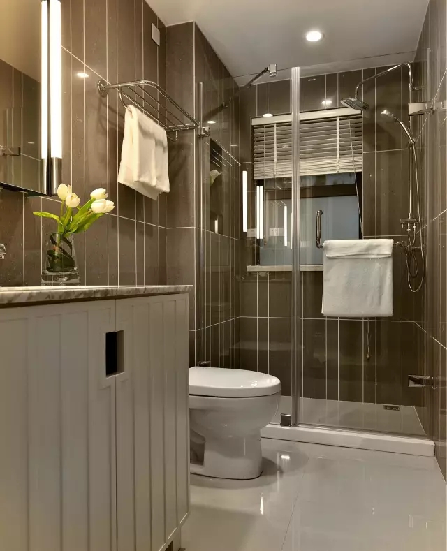 卫生间的金属墙砖很是抢眼,灯光的照耀下显得格外耀眼,各类五金饰件也是整齐的摆放,总的来说就是很有现代感。