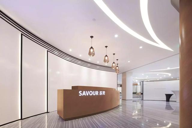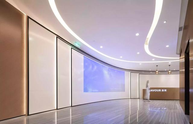 苏梵大朗店强调曲线也是平面布局给人的第一冲击点。从电梯出来,一条弧线割开平静的平面图,喇叭口吸纳了各色顾客。