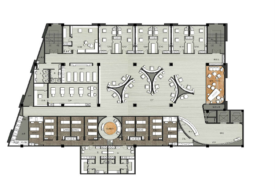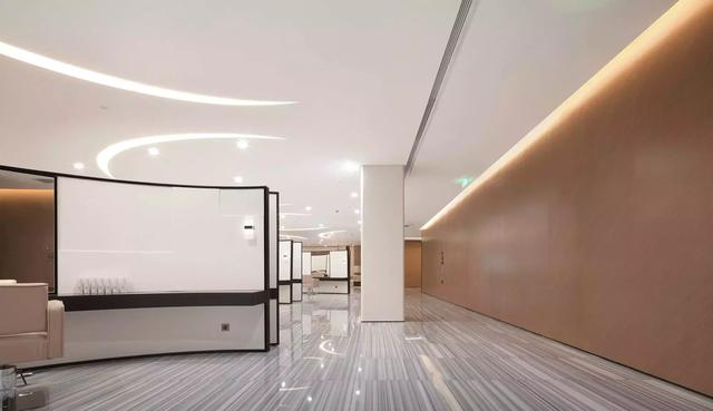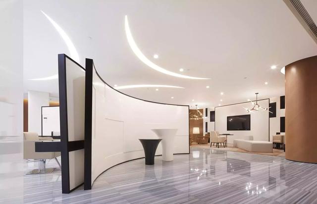 三人成众,空间被三个人字节点摆布出活力空间,空间中的行走方式极其顺畅。与之对应的是顶棚的区域,三条弧光以软膜形式暗藏与顶棚,呼应了地面布局。