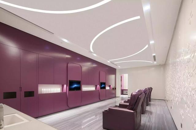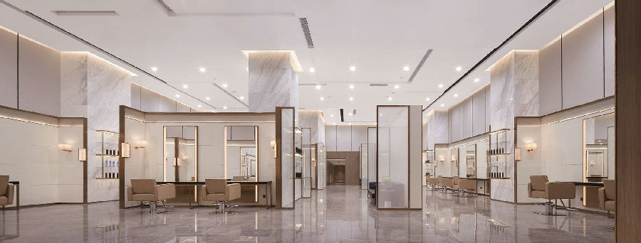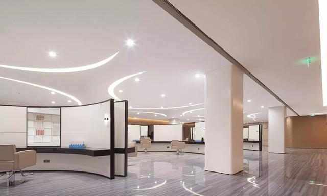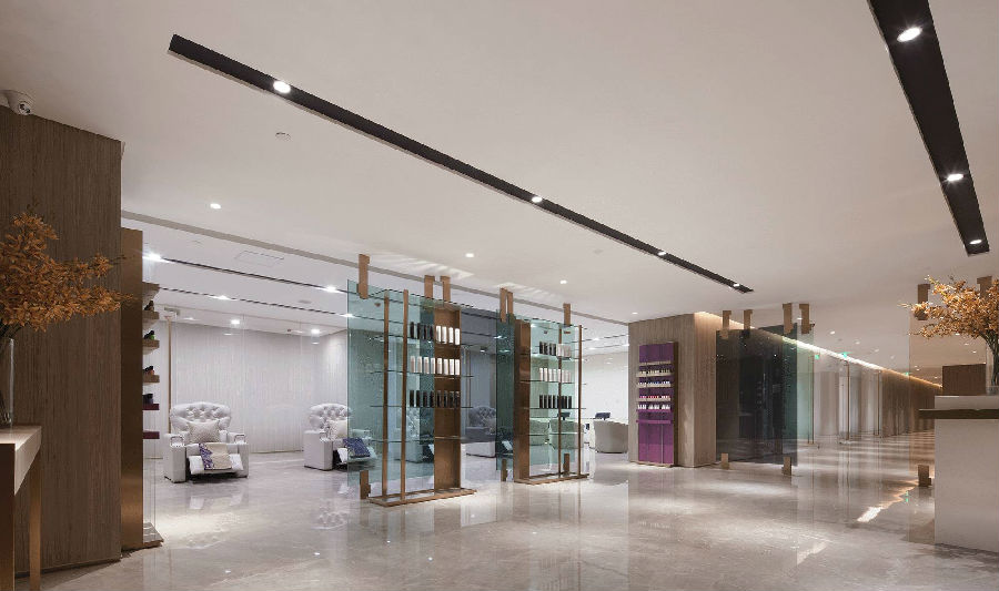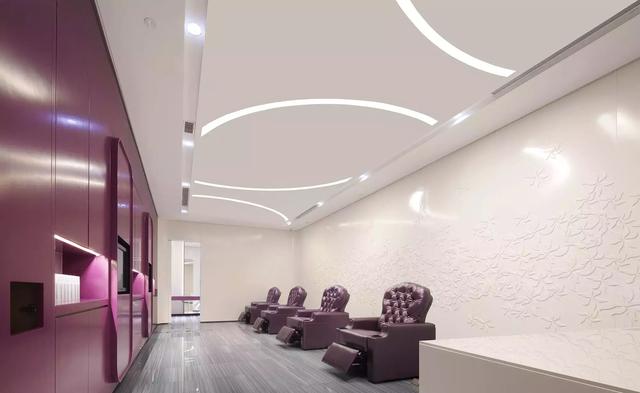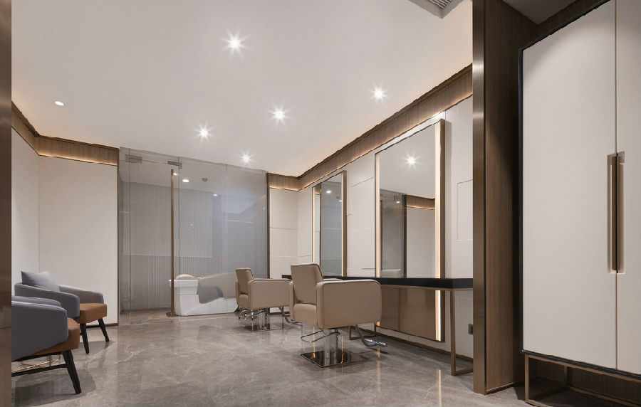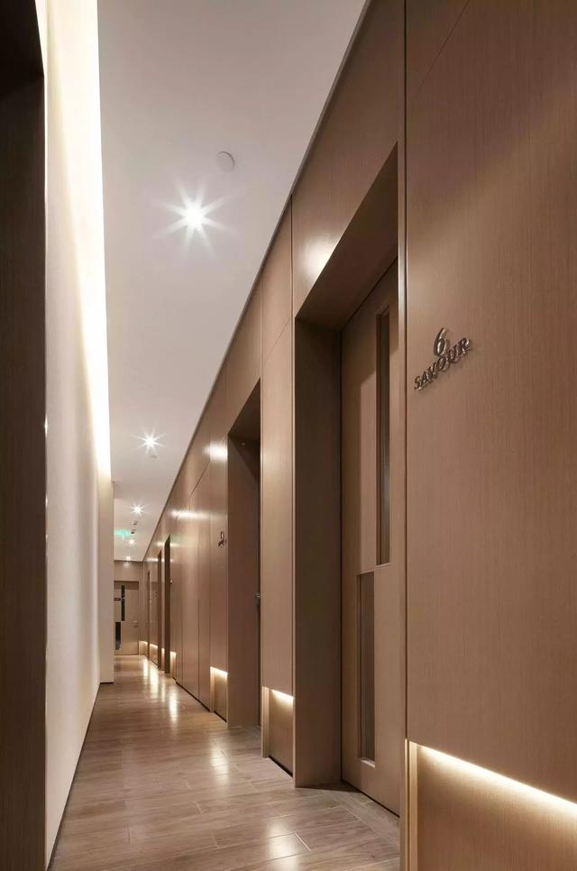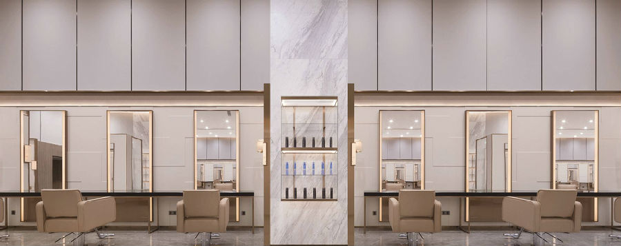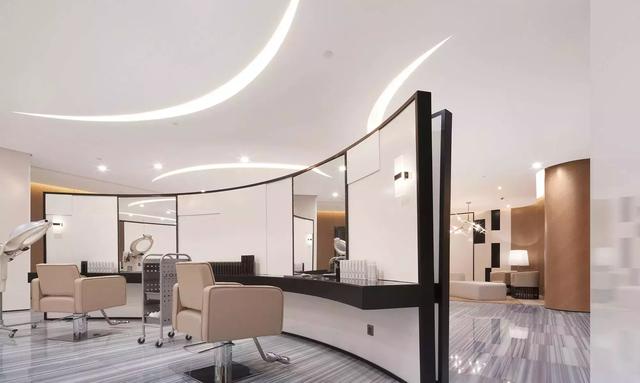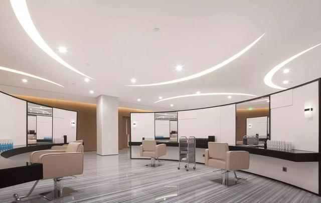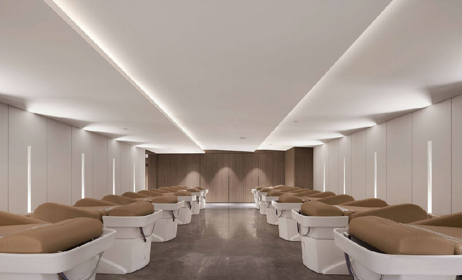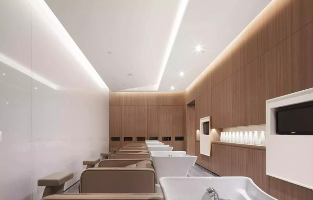 洗发区的用光洗练,几条灯带分割了顶棚,层次分明,线性壁灯从墙上提供了照度满足了操作需要。整体空间不加射灯,避免了刺眼的直射光带来的眩晕感。