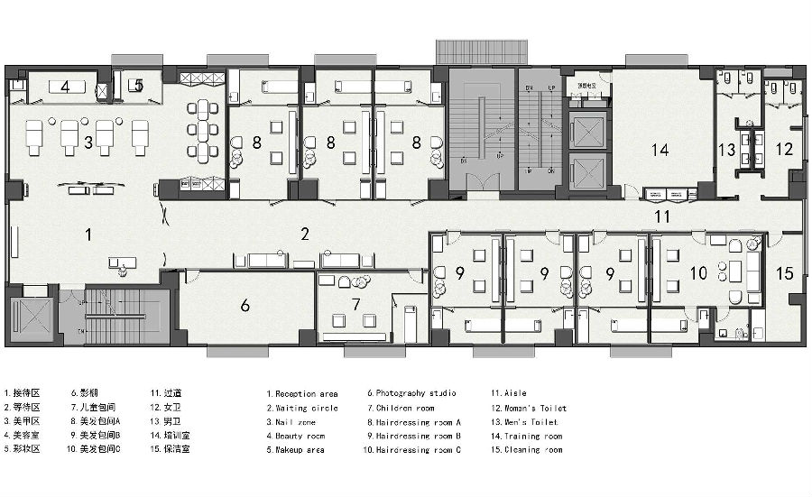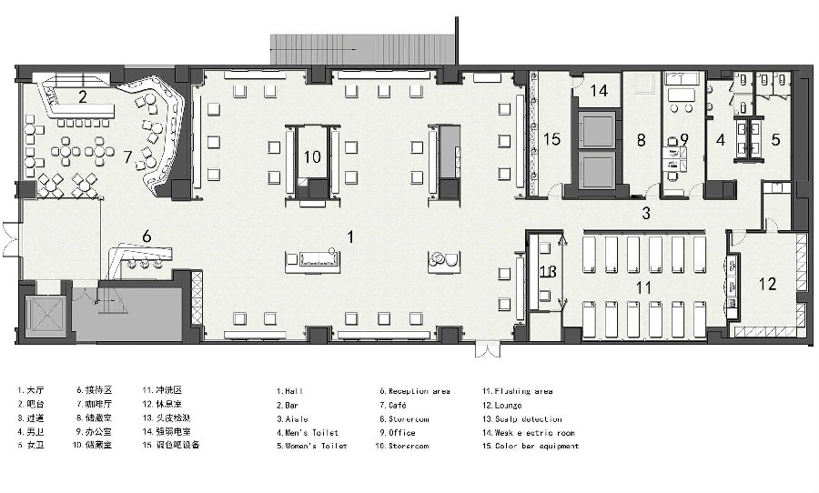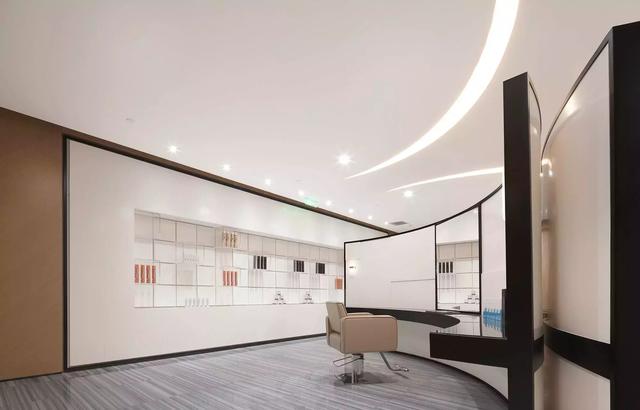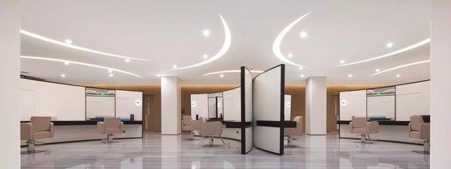 操作区的曲线致敬极少主义雕塑家理查德•塞拉,打破了方正空间的束缚,结合柱网,锚定了三个人字形的美发区域。