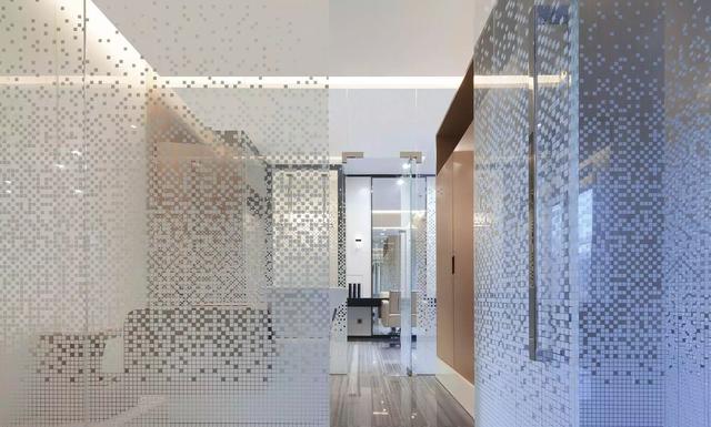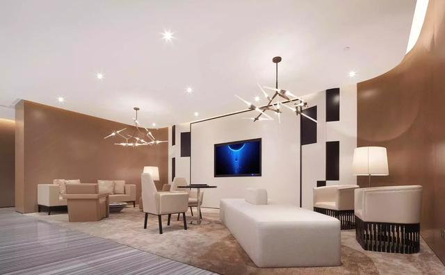 大堂整体设计以方正的几何形式自由搭配。天花设计造型如同蒙德里安的冷抽象画,凹凸随机,富于层次感。