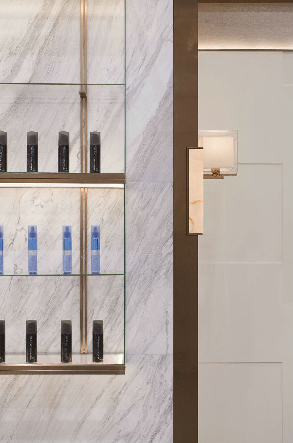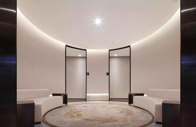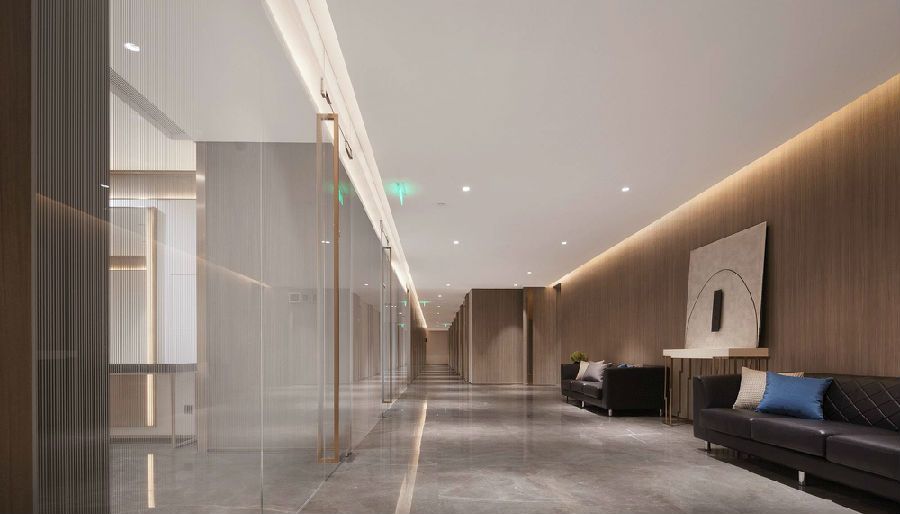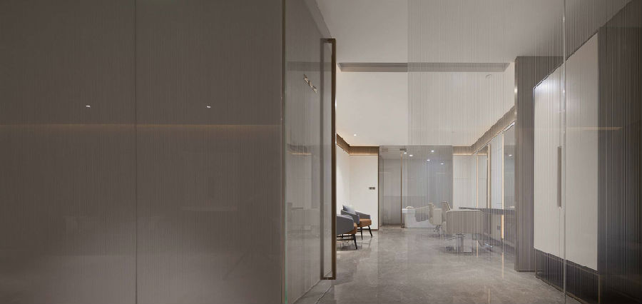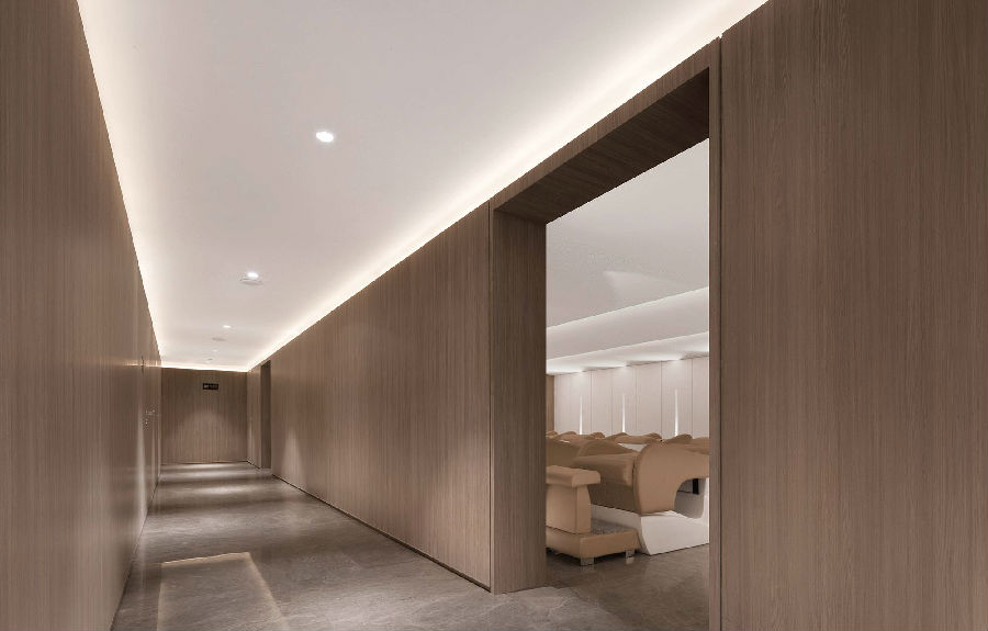 室内空间立面设计使用了横竖基本分割,细节收口一丝不苟。光源柔和地隐藏在灯槽中,丰富了阳角转折的细部。