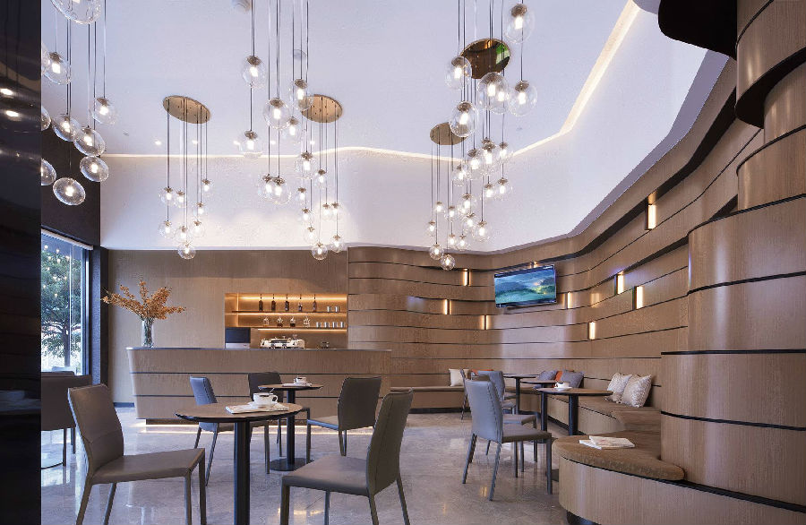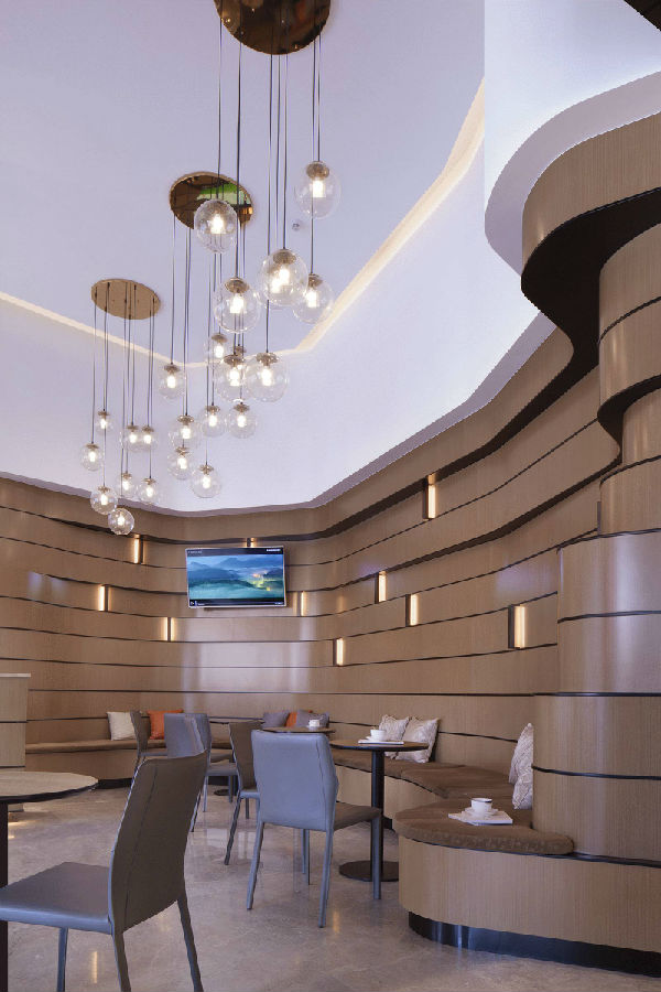 入口咖啡厅的墙面处理亦不可不提,灵感来自大自然的元素——梯田。无棱的曲面造型将脉脉温情传递给每位光顾的客人。