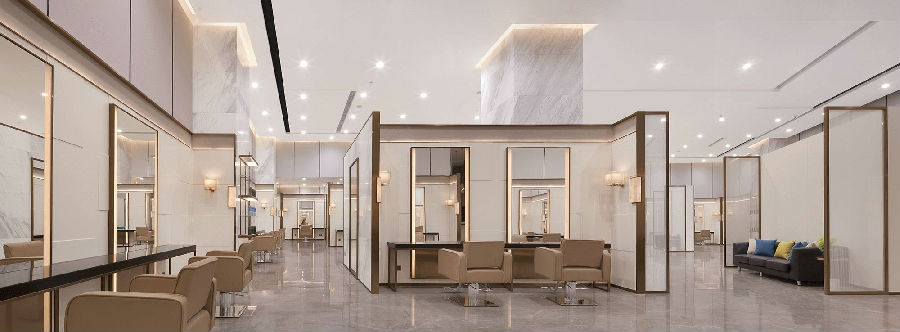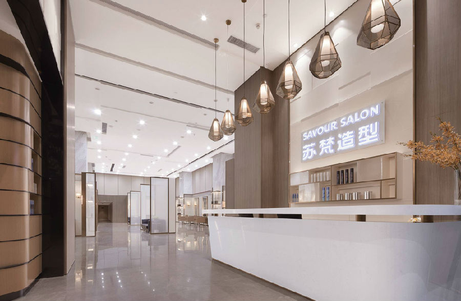 主创设计:姜晓林,闵耀 设计公司:共向设计 项目开发:苏梵造型 项目地点:东莞 项目面积:1200平方米 主要材料:烤漆板、木饰面、白纹玉、黑钢、艺术玻璃
