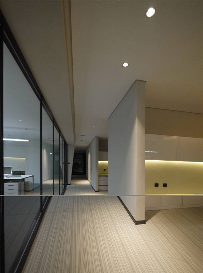 三、与开敞区不同,封闭办公室选择了重色系的编制地材,这种可以回收的环保材料在灯光的映衬下显出丰富的机理质感。