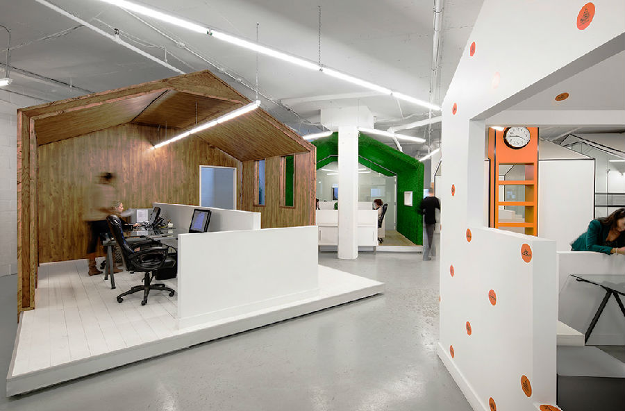 目前,有许多设计师将明度较高的绿色引入办公室,这类设计往往给人 一种良好的视觉效果,从而创造一种春意,这也是一种明快感在室内的创意手段。