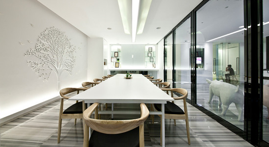 前台接待区面对开敞式的会议室,该空间拥有图纸展示、多媒体展示等功能,用于员工的讨论和会晤,会议椅摒弃了传统办公椅的造型,选用原木中式休闲椅,给严肃的会议室增添了丝丝创意与亲切感,墙壁上大大的百鸟归巢立体画,寓示公司时刻凝聚无穷的力量。