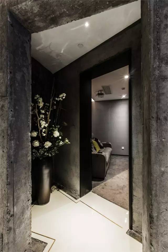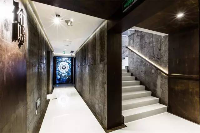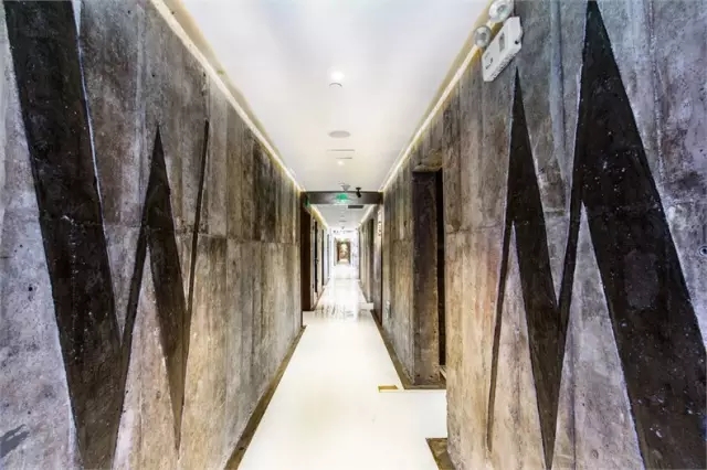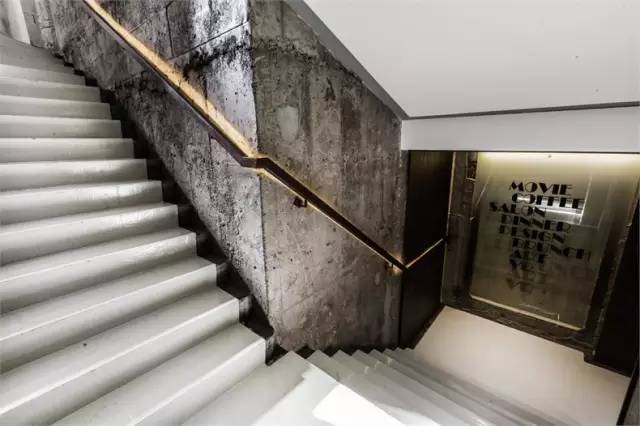 从入口处进入楼梯直至走廊公区,地面为灰白色环氧自流地坪,嵌入地面的黄洞数字标示了沿走廊分布的10个大小不等的影厅。走廊仅对天花和地面进行了处理,而两侧的墙壁被恢复到了初始状态,粗与细的反差十分强烈。