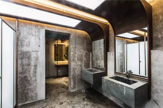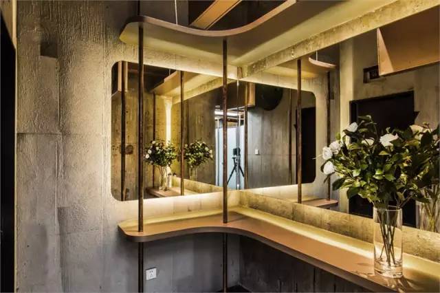 主要材料:清水混凝土保护漆、竖纹玻璃、锈钢板、环氧自流平地面、复古镜面、黄铜。