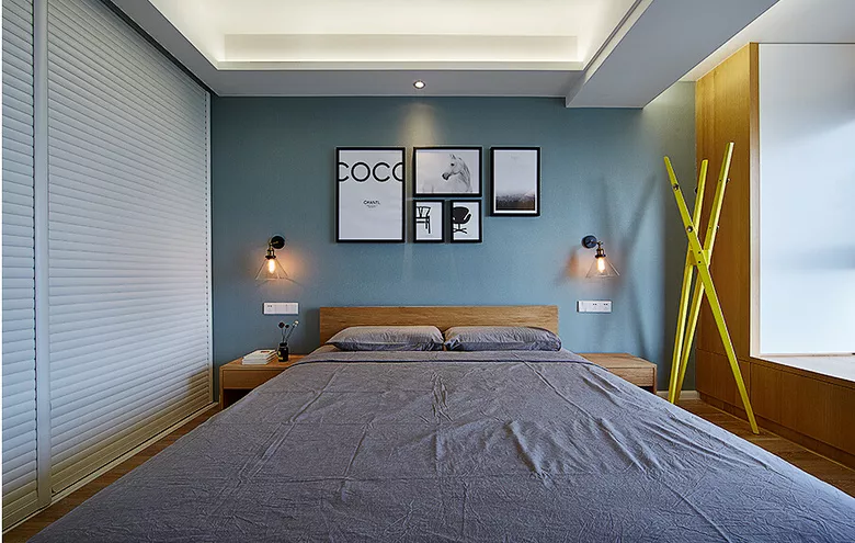 ▲蓝色床头背景墙,搭配工艺壁灯,和墙上的黑白画,颇有北欧风。黄色的衣架,明媚了空间,灰色的床褥,温馨舒适。