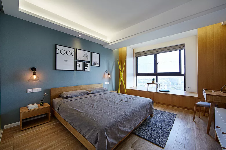 ▲敞亮的木色飘窗增加一张小木桌和一块蓝色坐垫,看看书,品品茶,或者来盘棋,陶冶情操的同时,弘扬中华传统文化。