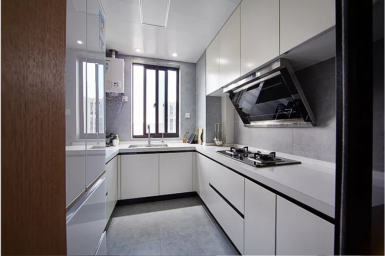 ▲白的橱柜,搭配灰色瓷砖,提高厨房明亮度,增加采光。根据主人一家生活习惯购置的三层冰箱,满足家人的使用。