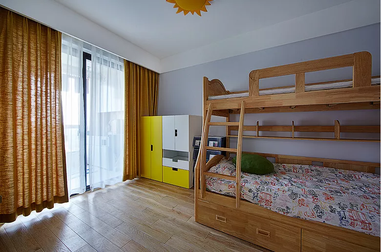 ▲太阳造型的吸顶灯,可爱充满童趣,增加了儿童房的趣味性。原木色的窗帘延伸了原木地板的颜色,在视觉上营造空间感。带有收纳空间的上下铺儿童床,节省了活动空间,也为即将到来的二胎做了准备。