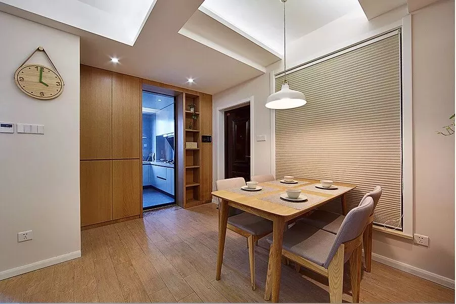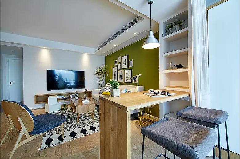 ▲吧台对着电视墙位置,木质的吧台面,简单舒适,在阳光下散发着淡淡的原木清香。白色的柜子和吧台的吊顶是同样的材质,让视觉有了延伸感。