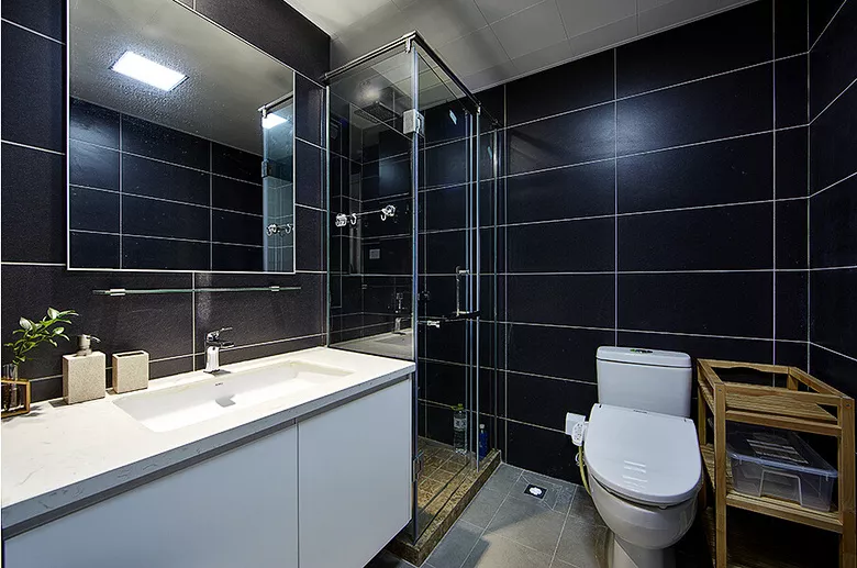 ▲四面黑色的横条瓷砖,搭配白色盥洗池,给人高档感,在视觉上扩大空间,形成延伸感。