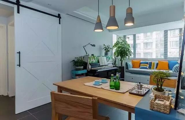 ▲餐桌椅和那些客厅里的那些柜子一样,都是原木色。三盏小吊灯,铁艺网格照片墙,感觉很有文艺的范儿呢。