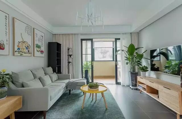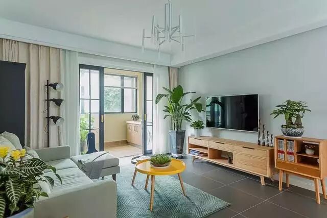 ▲电视柜和小边柜,都是浅色原木风,配上盆景和大绿植,散发出浓浓的大自然气息。深灰色地板也非常大气呢。