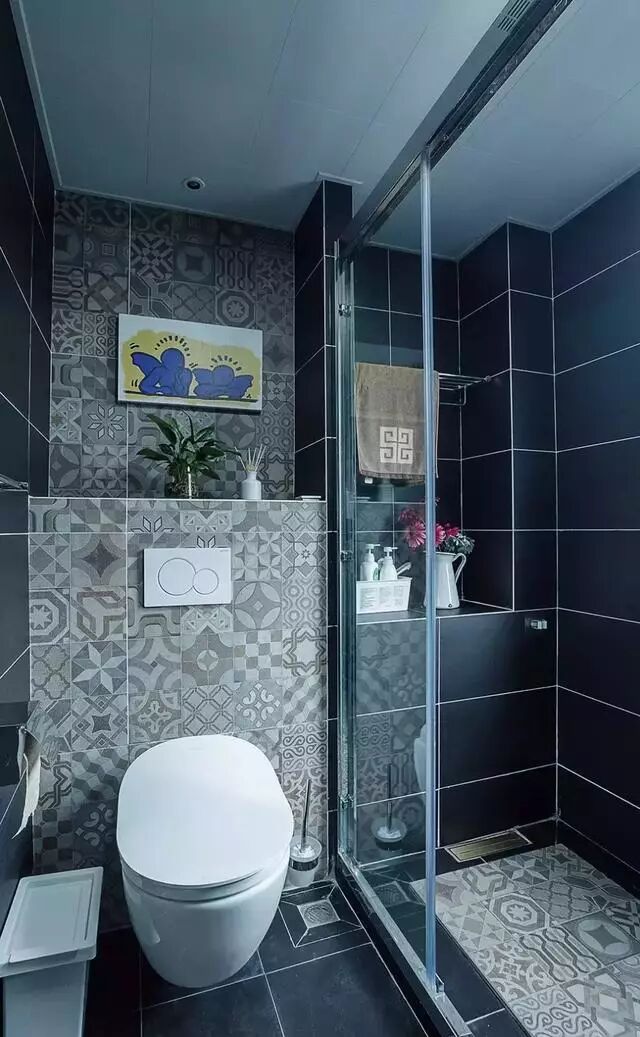 ▲卫生间的话,色调搭配偏沉稳一些。因为黑色的基础上加入了花砖元素,整个空间显得更加时尚。壁画,绿植,鲜花,营造出清新的氛围。