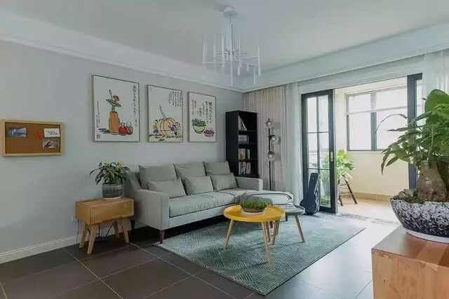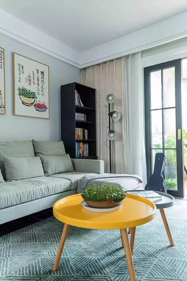 ▲小细节图。柠檬黄和浅蓝色的圆形小茶几提亮了整个空间,用小清新绿植代替鲜花,原来也可以这么美!靠墙的柜子用来摆书,彰显出文化品味。