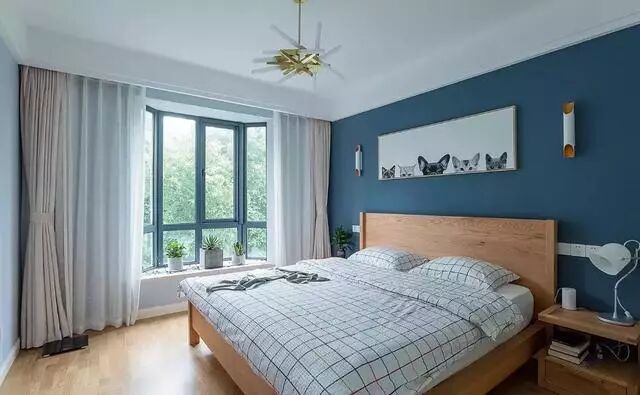 ▲主卧的设计也好惊喜!大大的落地窗,门外就是美丽的风景,打开窗,就能呼吸到新鲜的空气。深蓝色的背景墙搭配原木卧床,浅色布艺,清新舒适。