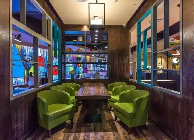 各种文艺、怀旧的小饰品为空间增色不少,墙壁上的波普艺术涂鸦为整个空间带来活力。家具及桌椅面料多选用皮革、布艺为主,配上抱枕点缀,沙发可以躺着,窝着,舒适感十足。