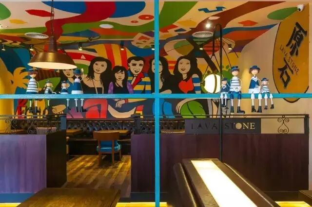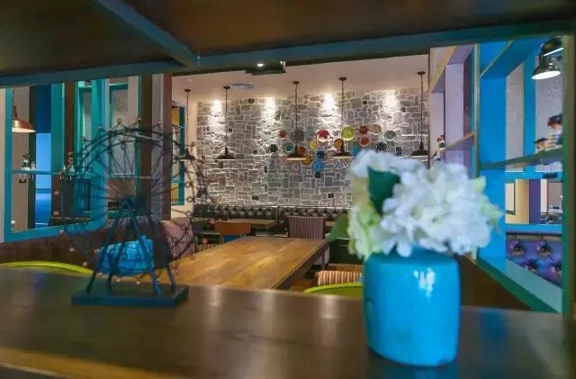 原石是一家以扒类为主的中西结合餐厅,同时融合了东南亚菜系。本案采取了混搭的设计风格,整体暗灰色的基调上大胆采用蓝色和黄色作为点缀,给人眼前一亮。时尚舒适第一,家具及桌椅面料多选用皮革、布艺为主,配上抱枕点缀。